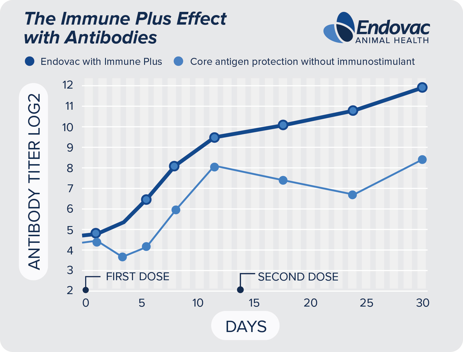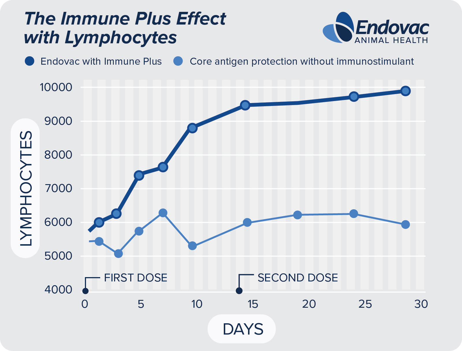 Immune Plus est un immunostimulant fabriqué par Endovac Animal Health. Immune Plus renforce le système immunitaire global de l’animal. Ce renforcement est essentiel pour la réponse à la vaccination et pour la santé globale de l’animal à des moments critiques. Comme le montrent les graphiques ci-dessous, deux principaux éléments du système immunitaire, les lymphocytes et les anticorps, sont considérablement augmentés par Immune Plus. Les principales fonctions d’Immune Plus consistent à renforcer la capacité du système immunitaire des animaux à lutter contre les agents pathogènes dangereux et à améliorer leur réaction à tous les vaccins administrés.